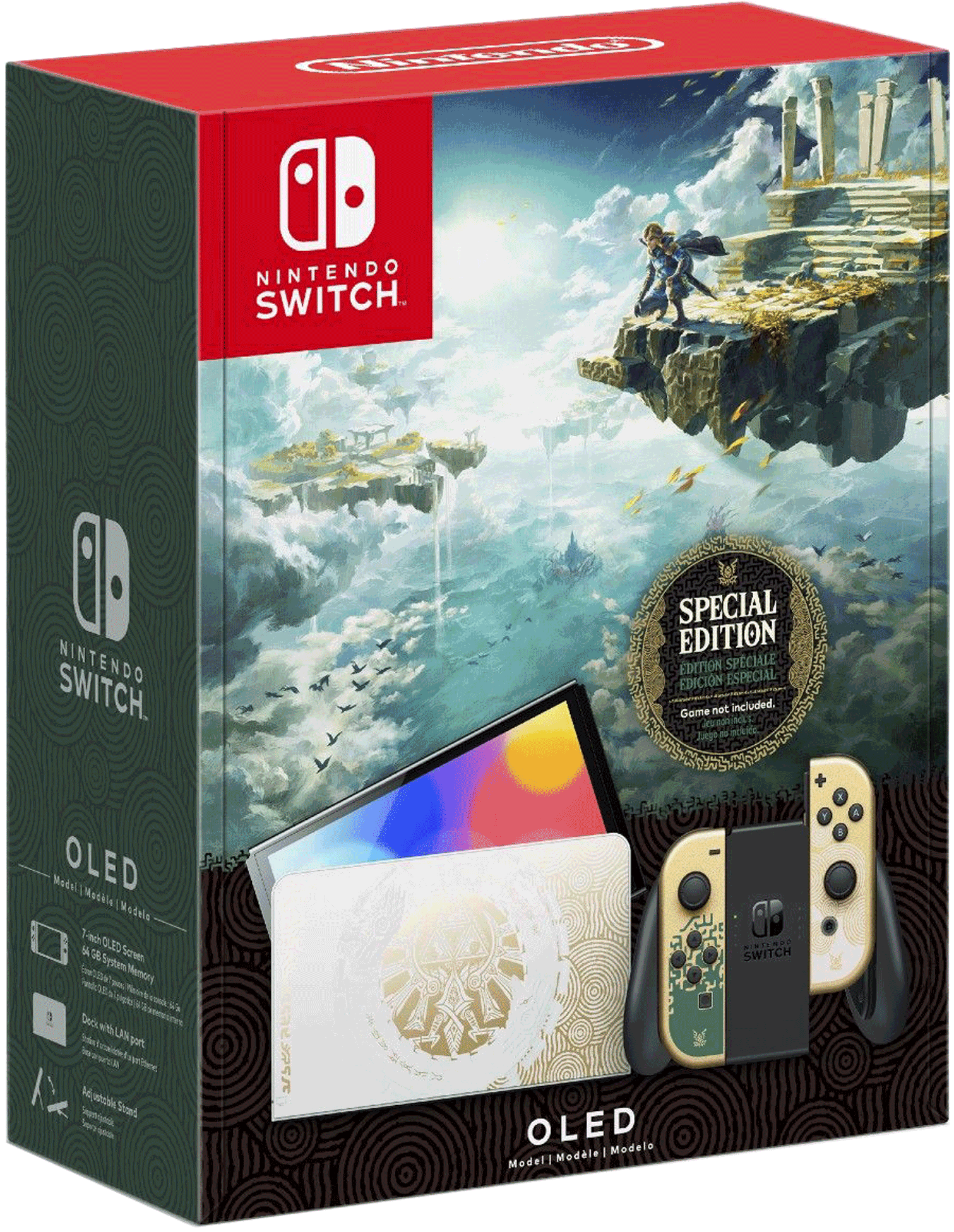 Консоль Nintendo Switch – Модель с OLED-дисплеем – ограниченная серия: The Legend of Zelda: Tears of the Kingdom Edition. Дизайн консоли выполнен по игре Legend of Zelda: Tears of the Kingdom, включая знаменитую хайлийскую эмблему из серии игр Legend of Zelda на лицевой стороне док-станции.